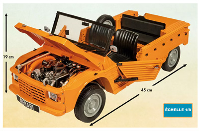 Il s'agit donc d'une maquette à l'échelle 1/8 dont la longueur fait 45 cm et qui s'élève à 19 cm. Reproduite avec des détails saisissants, la Méhari Altaya arbore une carrosserie identique au modèle original, tout comme les roues et les pneus qui sont authentiques. Les phares et les feux stop de cette réplique s'allument, le capot et les portières sont articulées et s'ouvrent. Même la portière arrière est rabattable. Enfin, le modèle réduit Méhari Altaya est accompagné de petits objets et articles de montagne et de plage.
