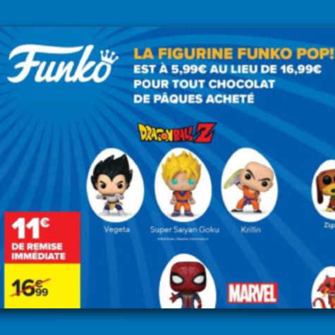 Le catalogue chocolats de Pâques Carrefour est arrivé et avec lui comme d'habitude son lot de promotions et de bons plans pour les gourmands, mais aussi les collectionneurs. La principale bonne affaire de prospectus à destination des gourmands concerne bien évidemment les chocolats avec une opportunité pour les collectionneurs de figurines à grosses têtes. En effet, l'enseigne nous invite à bénéficier d'un deal vraiment intéressant, il ne s'agit pas ici d'une offre carefour BD à 1€ comme les magasins en ont l'habitude. Il s'agit ici d'obtenir chez Carrefour 16 figurines POP DragonBall Z, Marvel et Disney en édition limitée à 5,99€ seulement.