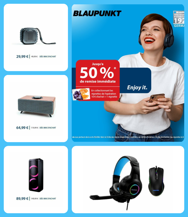 Bon plan collecteur vignettes Blaupunkt Supermarchés Match et Match Drive avec jusqu'à 50% de remise immédiate sur des produits de la marque. Enceinte, écouteurs sans fil, casque sans fil, souris gaming, complétez votre collector Blaupunkt Match et profitez de cette opération réservée aux porteurs de la carte de fidélité et dans la limite des stocks disponibles.